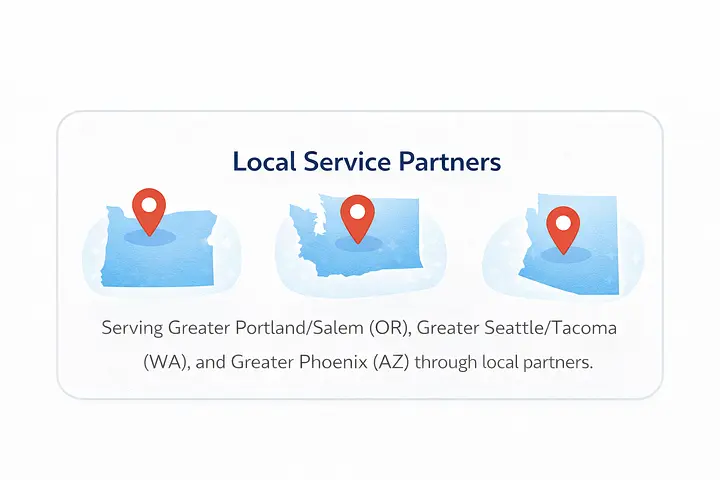 Serving Greater Portland/Salem (OR), Greater Seattle/Tacoma (WA), and Greater Phoenix (AZ) through local partners.